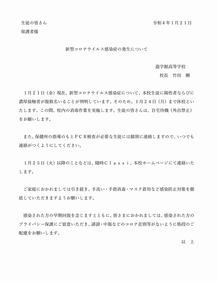【全校生徒及び保護者様へ】新型コロナウイルス感染症の発生について(第2報)