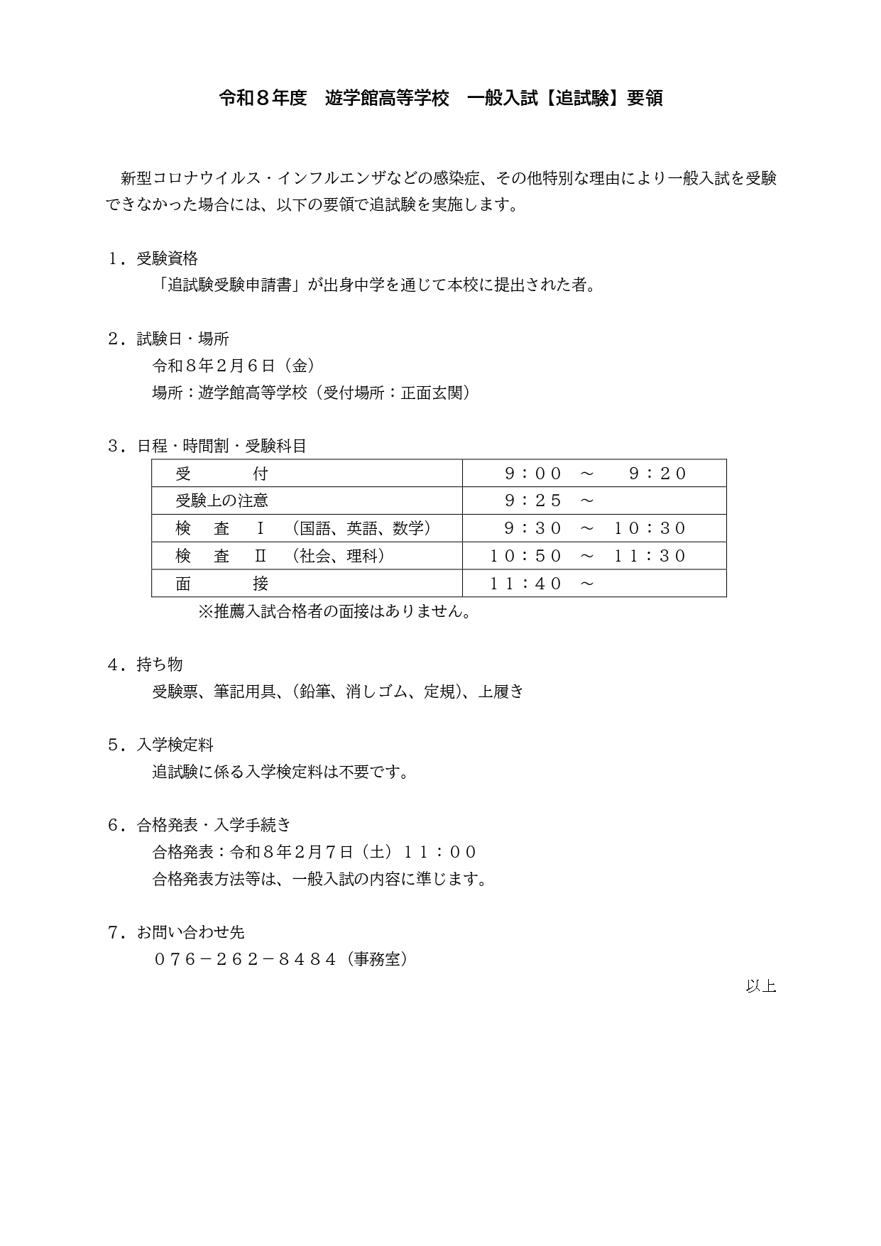令和8年度 遊学館高等学校 一般入試【追試験】の要領を公開しました