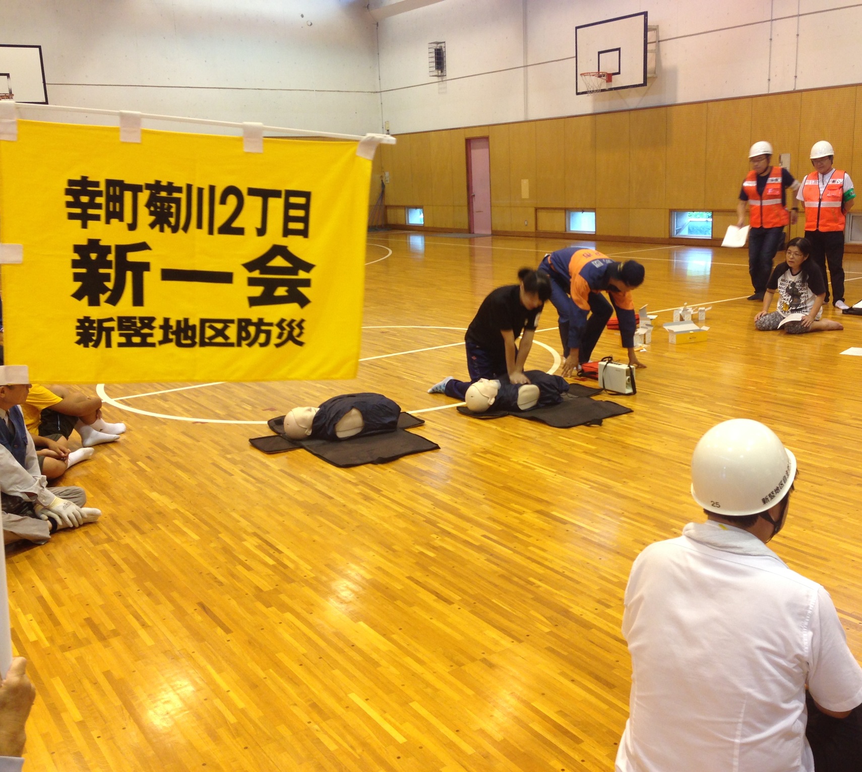 8月30日(日)午前、新竪町校下の8町会、約100名の方々が、一時避難場所に指定されている本校第2体育館への避難訓練を行いました。各町会ごとに避難を終えた後は、簡易担架の作り方、人工呼吸やAEDを含めた心肺蘇生などの講習が行われました。