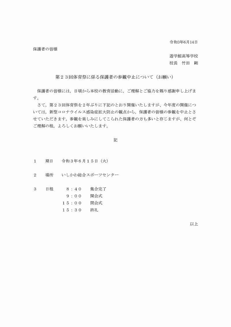 【保護者様へ】第23回体育祭に係る保護者の参観中止について(お願い)
